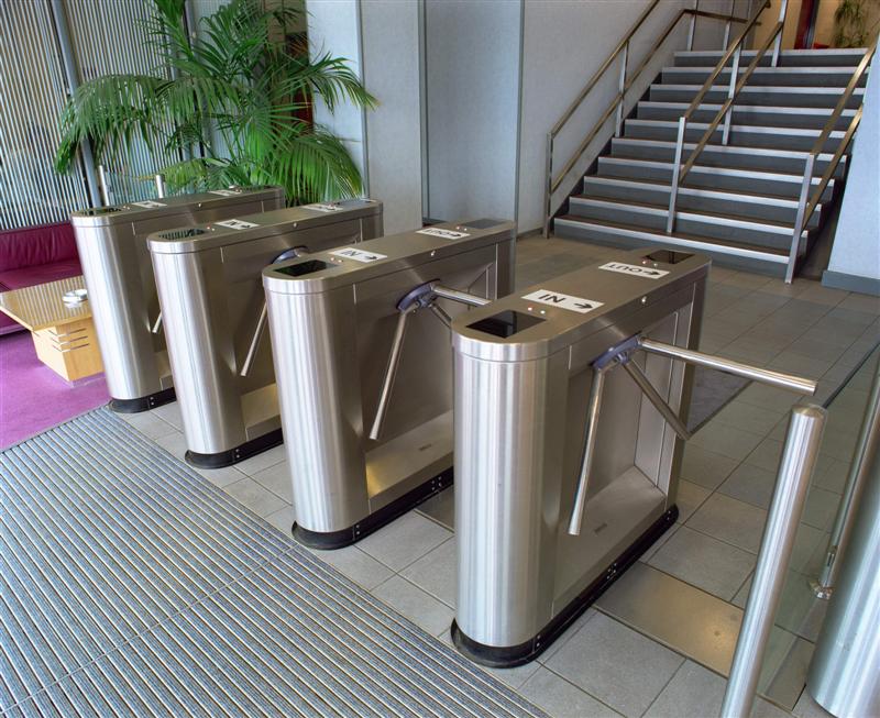 • Триподы считаются бюджетным вариантом. Несмотря на стоимость, выглядит турникет современно и смотреться в любом офисе. Называется этот турникет именно так, потому что его конструкция состоит из трех хромированных штанг, расположенных друг от друга под одинаковым углом;